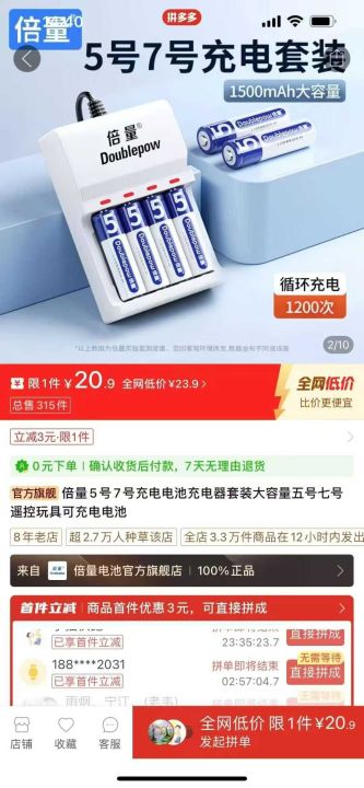 倍量充电套装。低价处理!4槽充电器+4节5号电池!1000...