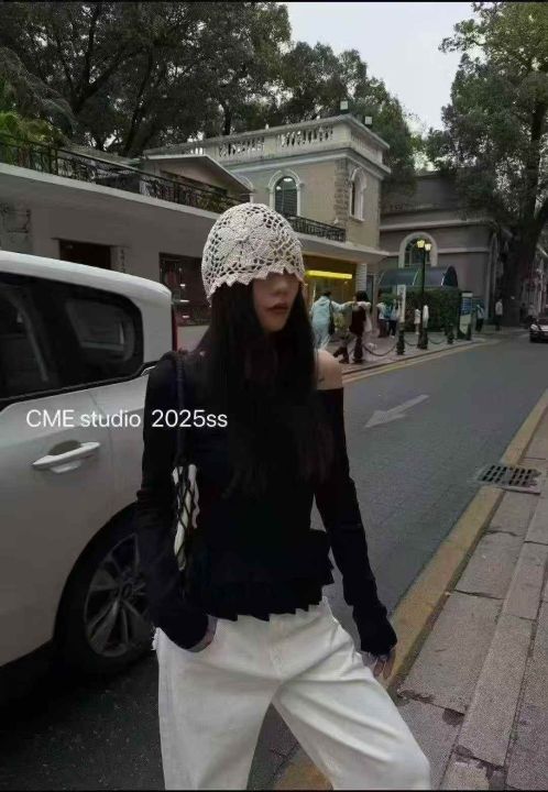 18.8荷叶边设计感斜领露肩甜辣修身长袖T恤女早春花边...