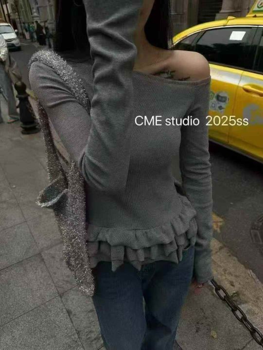 荷叶边设计感斜领露肩甜辣修身长袖T恤女早春花边打底衫
