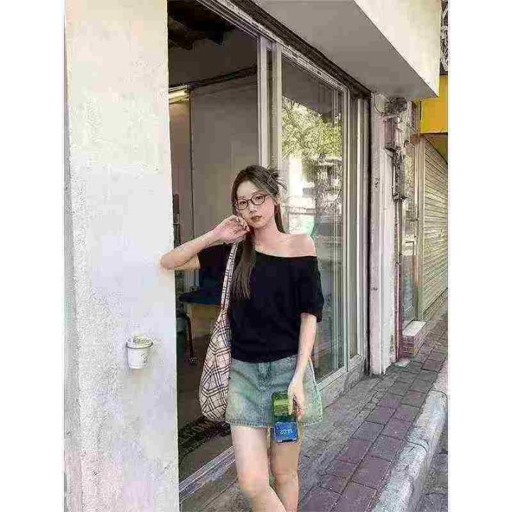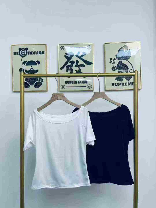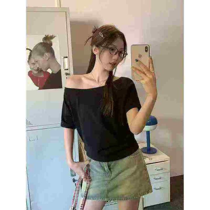 冰丝螺纹斜肩一字肩短袖t恤女新款夏上衣,单款两色,码数S-XL,独立包装,数量219件