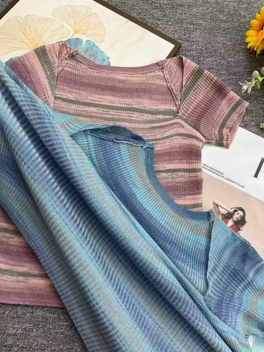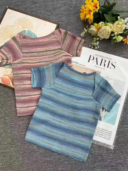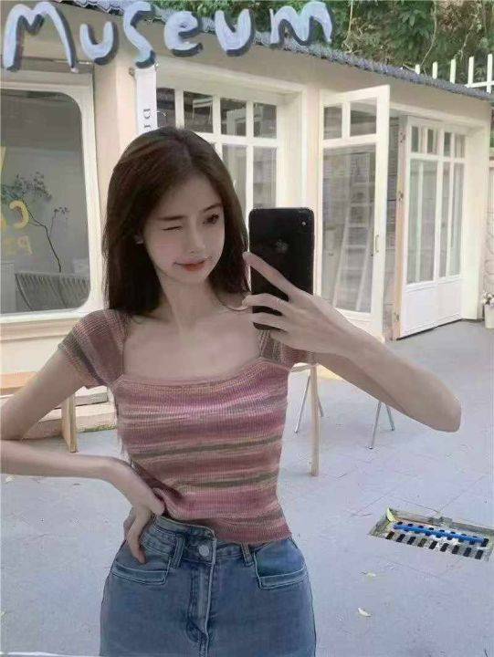 夏季新款方领撞色条纹简约复古文艺时尚减龄针织T桖,独立包装,均码面料软糯舒适弹力大,420件,腾仓库,全清4.9元亏本处理!