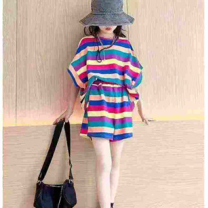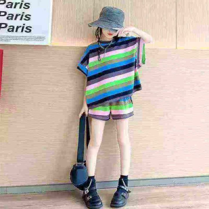 女中大童夏季时尚彩条T恤短裤套装,珠地网眼面料,216套,2-7码,独立包装,全清7.8元