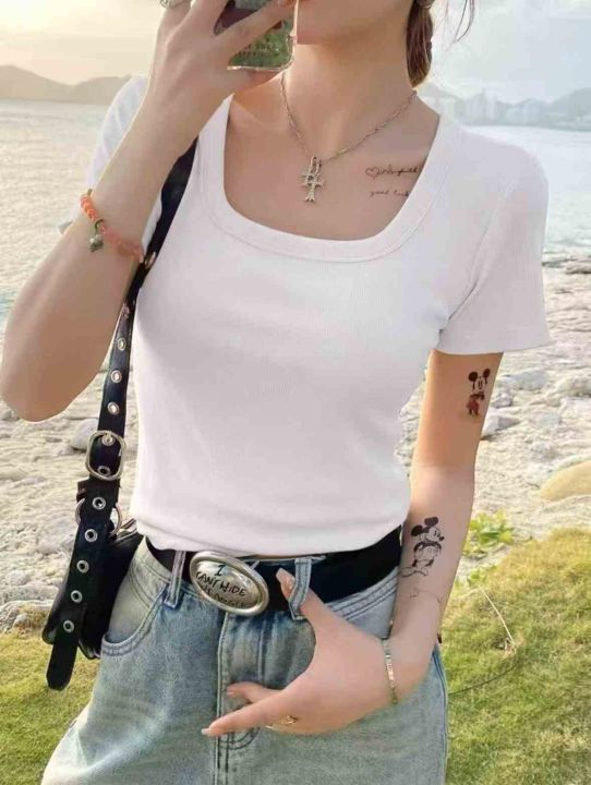 [月亮]:5.5清2242件[月亮]:简约时尚方领锁骨短袖T恤...