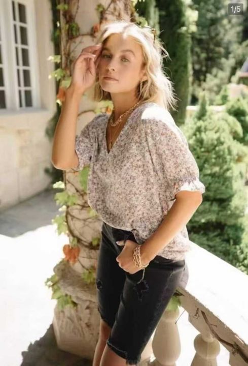 3.5清时尚大码女装洋气泡泡袖碎花V领上衣,单款单色,...