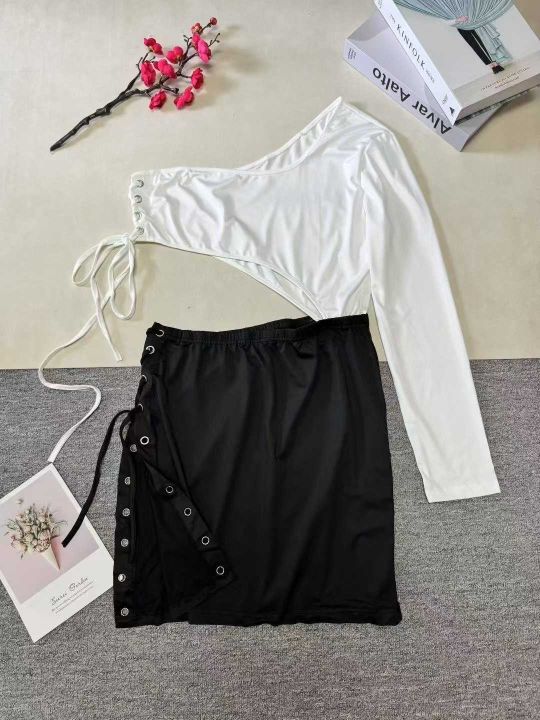 欧美性感时尚休闲绑带斜肩长袖裙子,整款三色,数量370套,码数S-2XL码,高弹力品质好,拉链式独立包装。