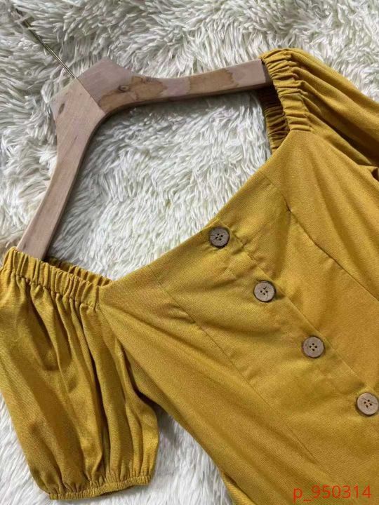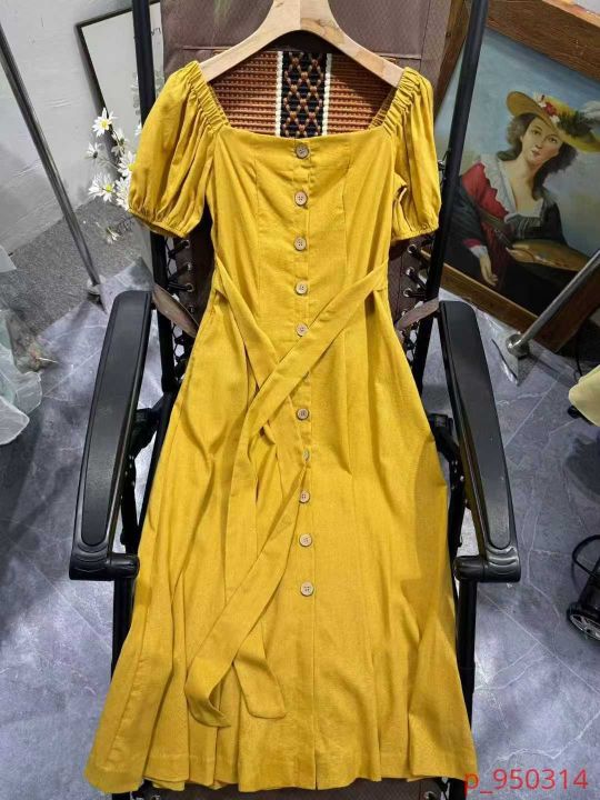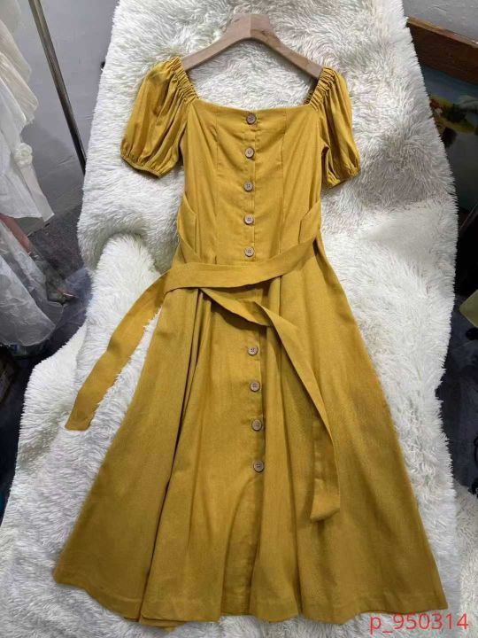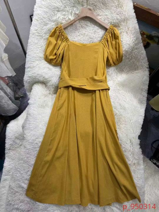 法式亚麻黄色收腰连衣裙夏季2025新款显瘦泡泡袖长裙