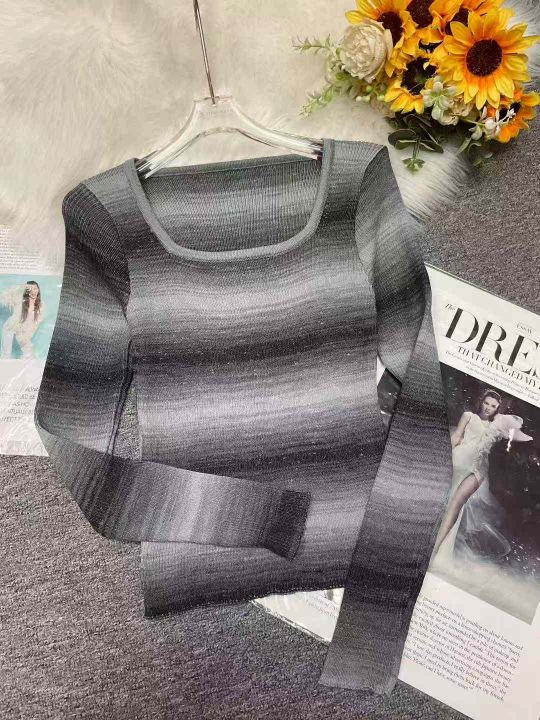 秋冬季新款设计感条纹方领甜辣弹力修身显瘦针织套头毛衣,独立包装,均码面...