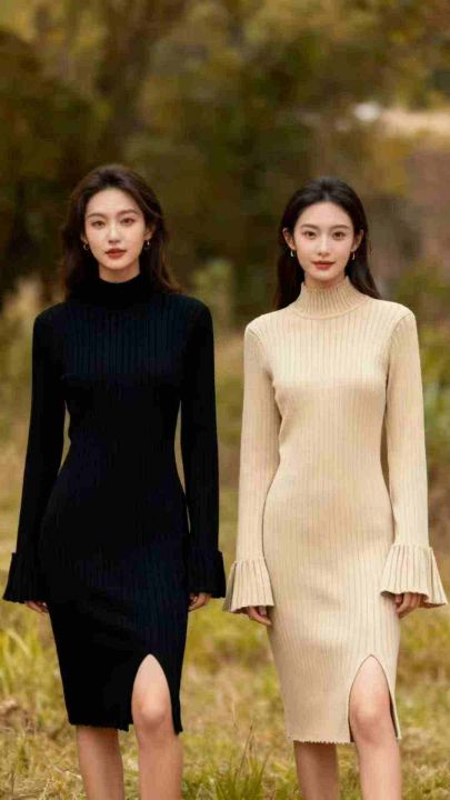 秋冬新款复古净版简约坑条半高领开叉针织毛衣连衣裙,面料柔软舒适弹力大,...