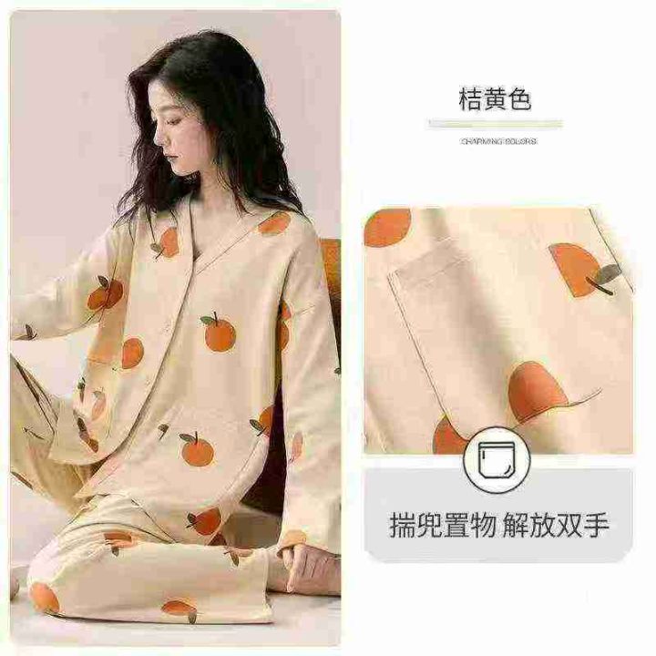 高档100%纯棉睡衣女春秋季长袖无领开衫女士套装宽松家...