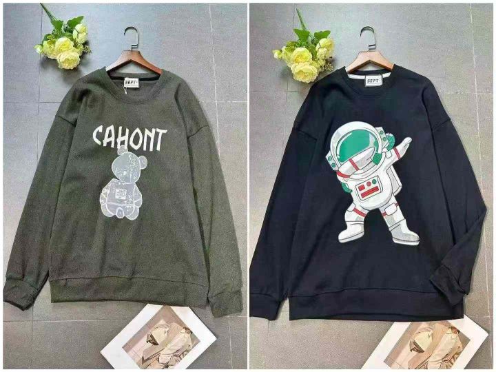 上身圆领卫衣[太阳]全清13.、300件、均码男女纯棉宽松休闲时尚字母图案印花长袖卫衣,大部分后领包边到肩,部分有吊牌,品质,这个性价比直接拉满✅全部全新独立包装、100/200件起多款混配13.3