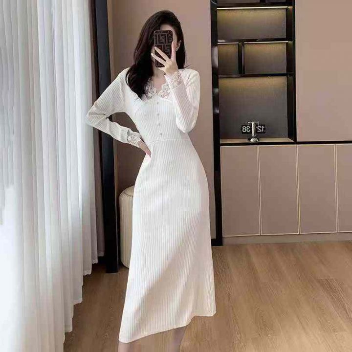 秋冬季新款蕾丝拼接时尚法式温柔风包芯纱毛衣连衣裙,独立包装,均码面料软...