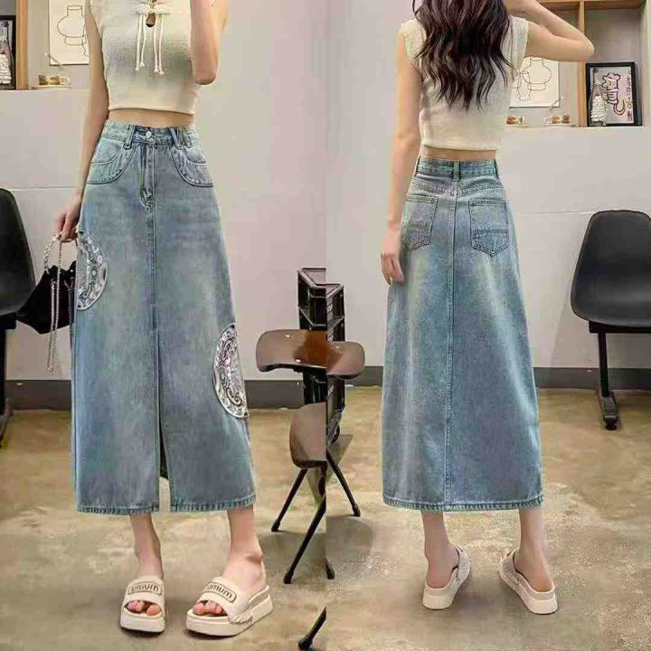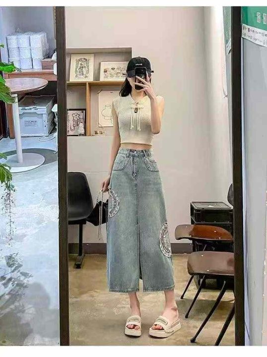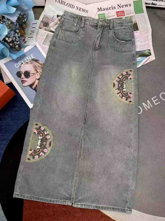 中国风宽松显瘦刺绣开叉长牛仔裙,单款单色2个长度,...
