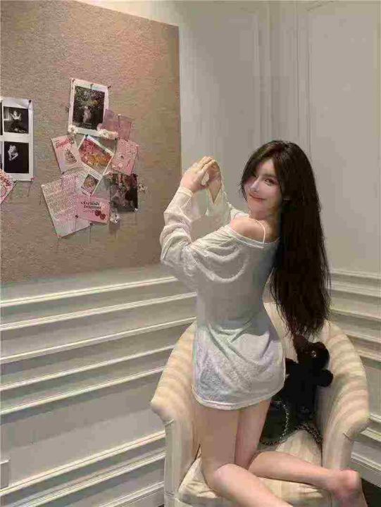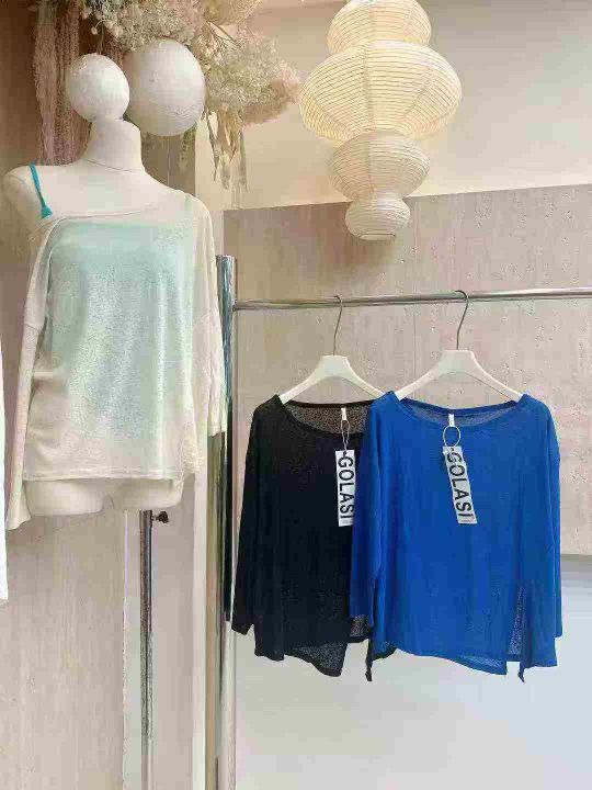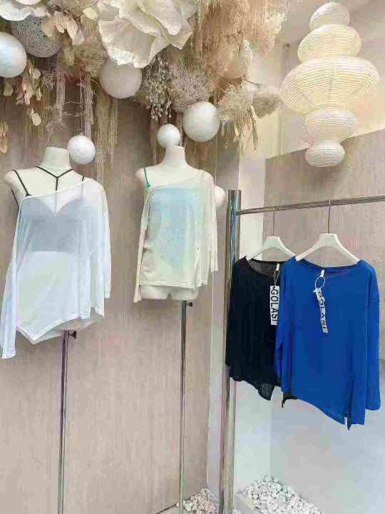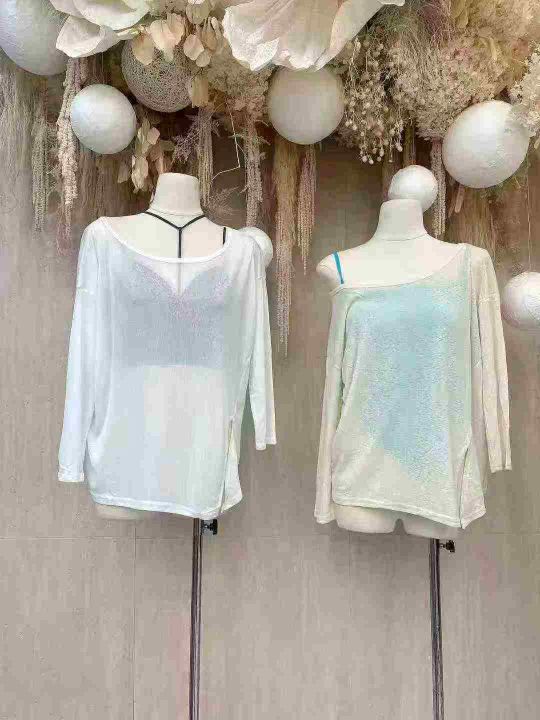 十三行高品质大吊卡防晒薄款上衣❤️上身巨好看~纯欲辣妹的既视感里面穿吊带超级好看,面料舒服不扎人,薄薄的微透超级美一字肩或者露肩穿都可以,均码✅蓝色少,杏色多,数量413件Ladies sexy sunscreen clothing, average size, quantity 413 pieces, clearing 3.9 RMB.