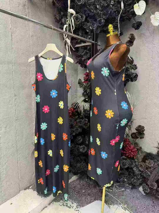 欧美风性感低胸撞色花朵吊带连衣裙女装收腰显瘦长裙,码数S-2XL,数量70件左右