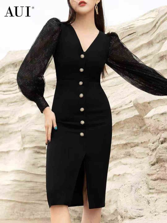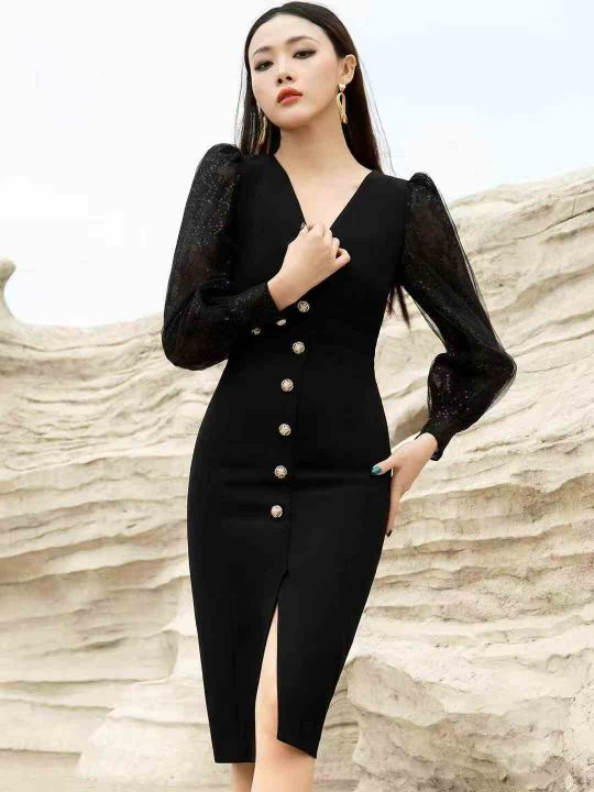 130件左右春秋新款气质黑色设计感泡泡袖V领修身中长款...