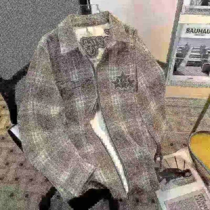 全清13.8美式vibe刺绣格子夹克男女同款春秋季宽松外套潮牌复古痞帅情侣衣服...