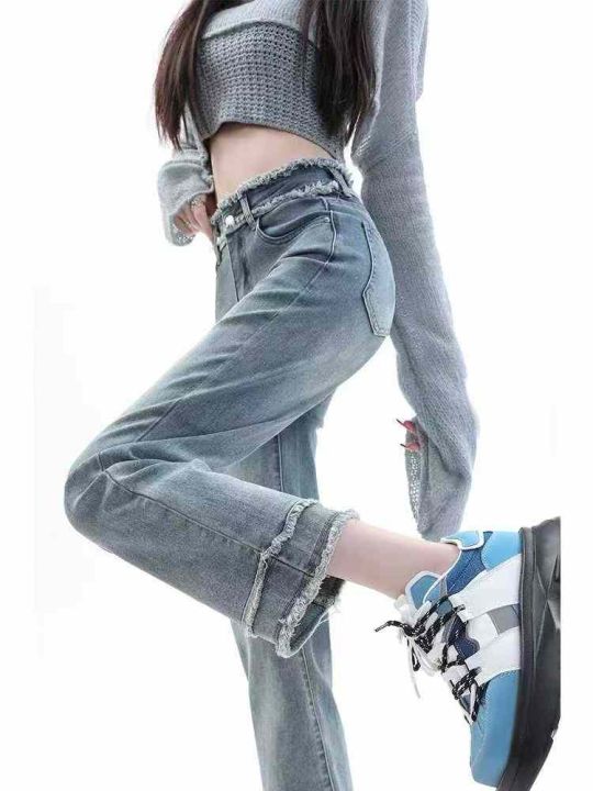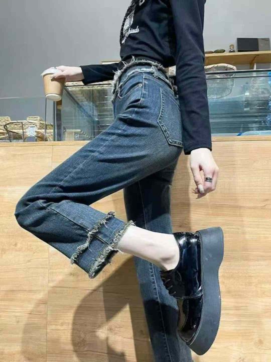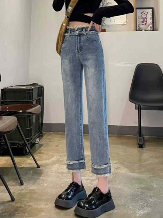 复古蓝窄版牛仔裤女春夏新款高腰显瘦设计感毛边九分直...