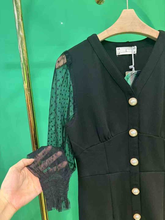 130件左右春秋新款气质黑色设计感泡泡袖V领修身中长款...