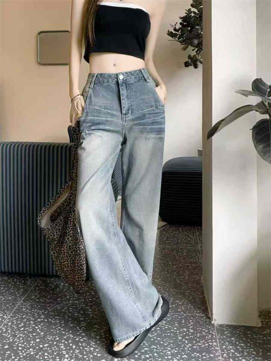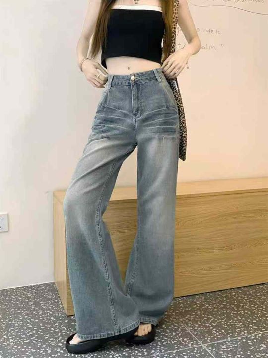 秋季新款洗水棉网红复古蓝半松紧腰阔腿牛仔裤,独立包...