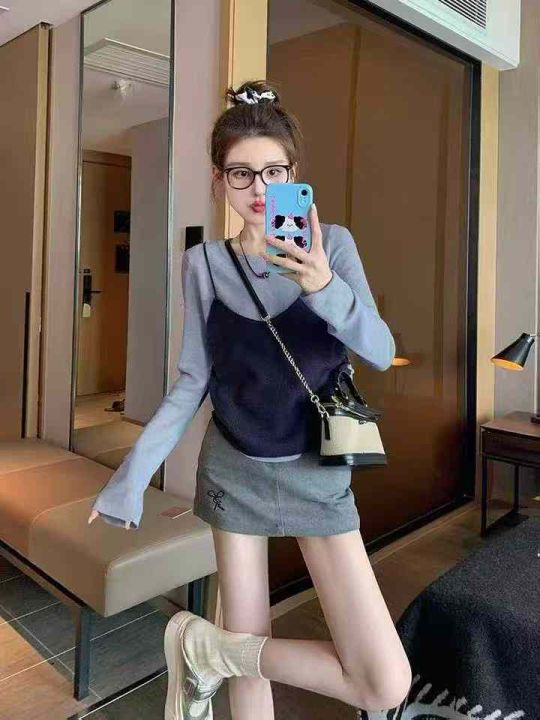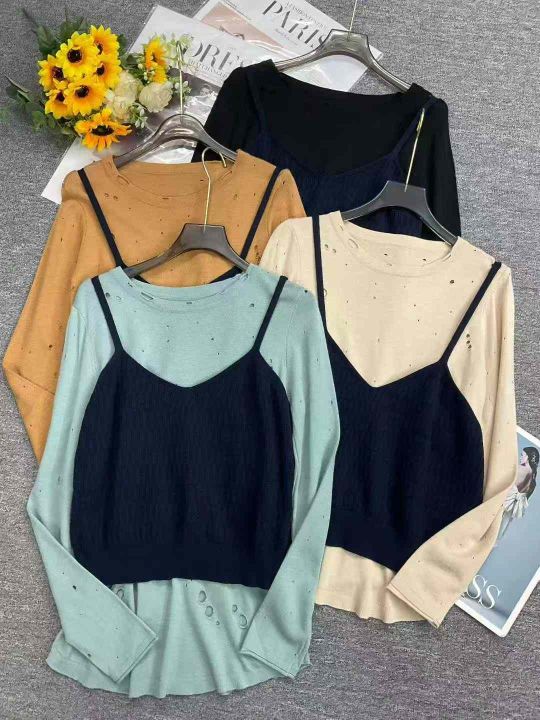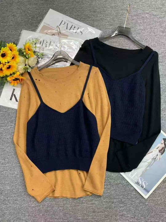 品牌原单女装早秋新款复古港风chic叠穿v领针织吊带背心马甲+设计款镂空针织长袖上衣2件套, 独立包装,面料软糯舒适弹力大,200套,全清7.9元超低价秒杀!