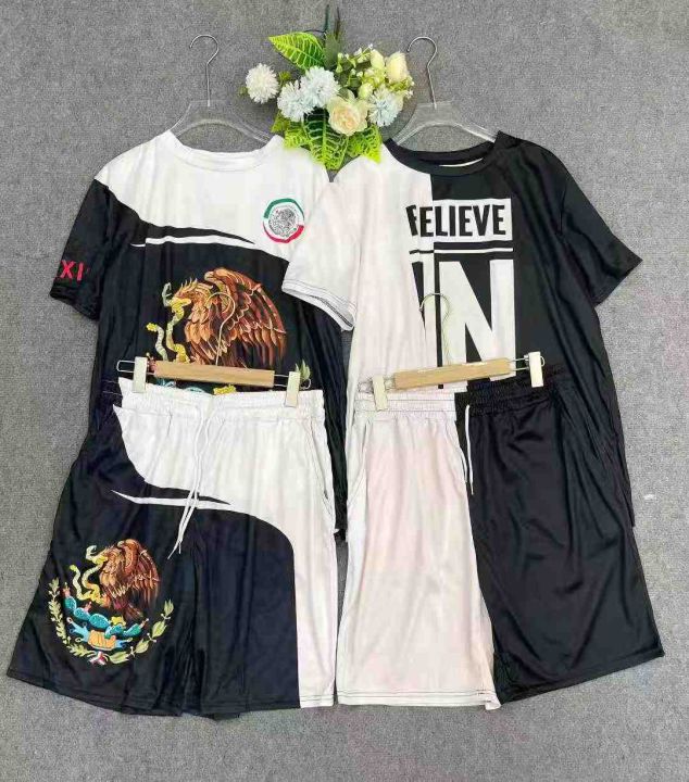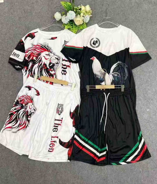 175套圆领印花短T套装。带有裤袋,后领包边,高弹力。码数:S一2XL.拉链式独立包装。面料有点串色,不影响穿着。亏本清仓处理,3.9全清