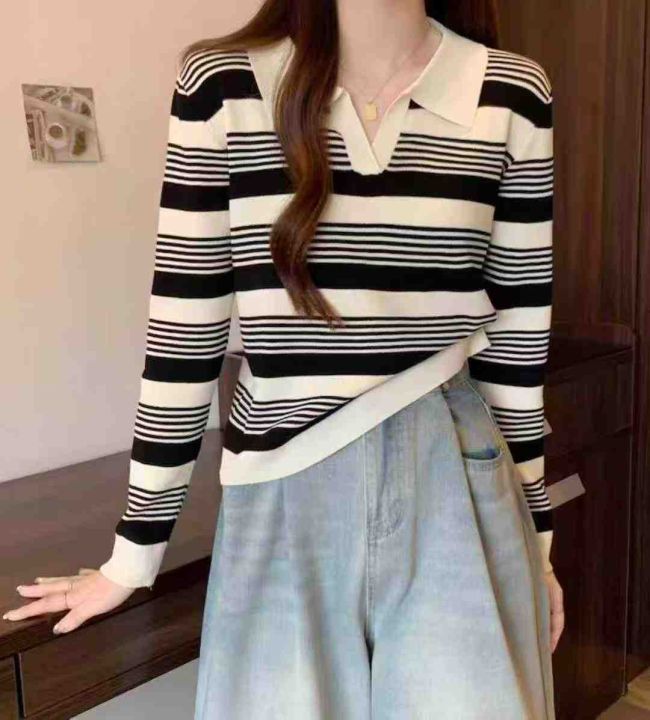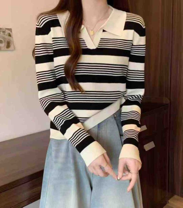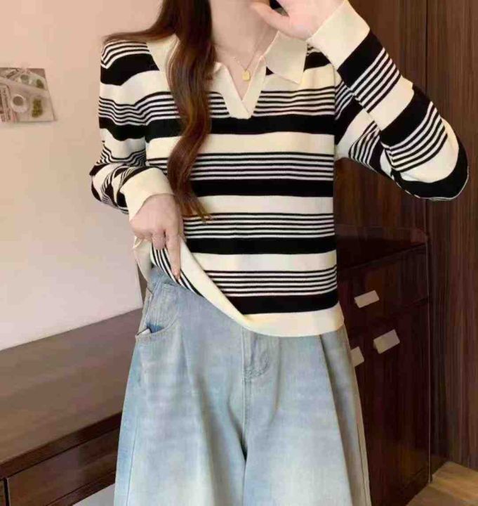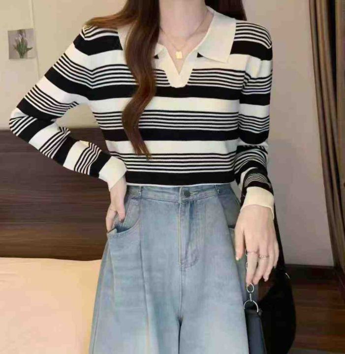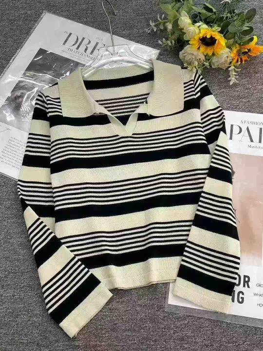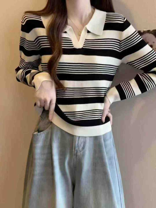 捡漏款,早秋新款韩版正肩翻领条纹长袖针织小衫,独立...