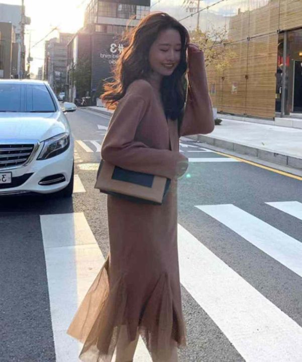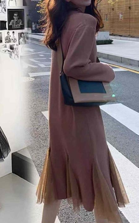 秋冬新款法式复古高端名媛优雅心机网纱针织毛衣连衣裙...
