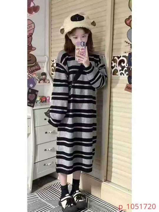 电商在售春季新款学院风条纹针织连衣裙小个子慵懒风打底内搭过膝毛衣裙,独立包装,面料柔软,均码80-130斤,650件左右,清仓价11.8分货➕1 _@_@