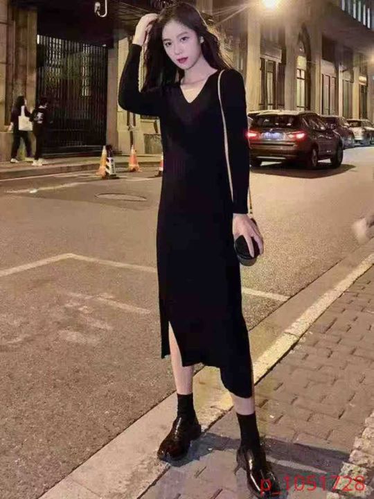 法式新款御姐风毛衣秋冬季显瘦裙v领打底裙中长款开叉...