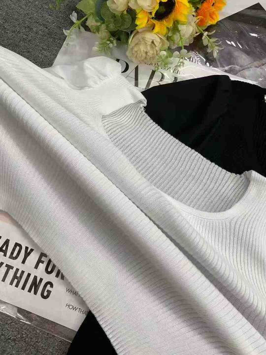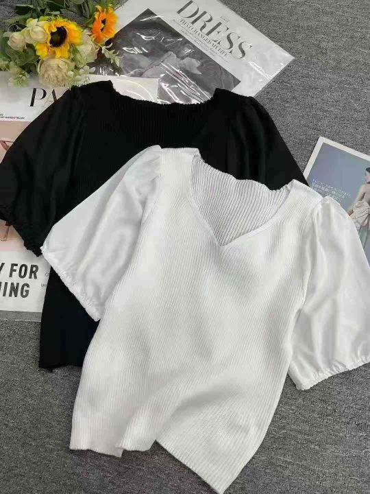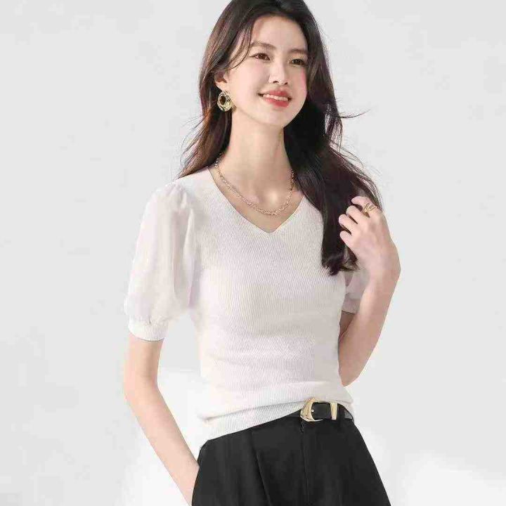 夏季新款法式复古v领雪纺拼接泡泡袖冰丝短袖针织小衫,独立包装,均码面料柔软舒适弹力大,400件,全清5.9元超低价秒杀!分货加一!