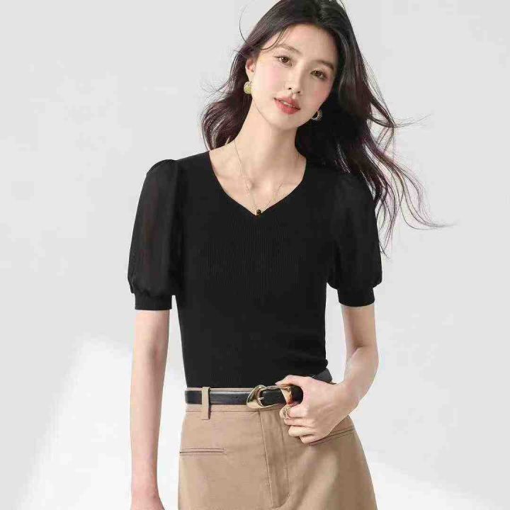 夏季新款法式复古v领雪纺拼接泡泡袖冰丝短袖针织小衫...