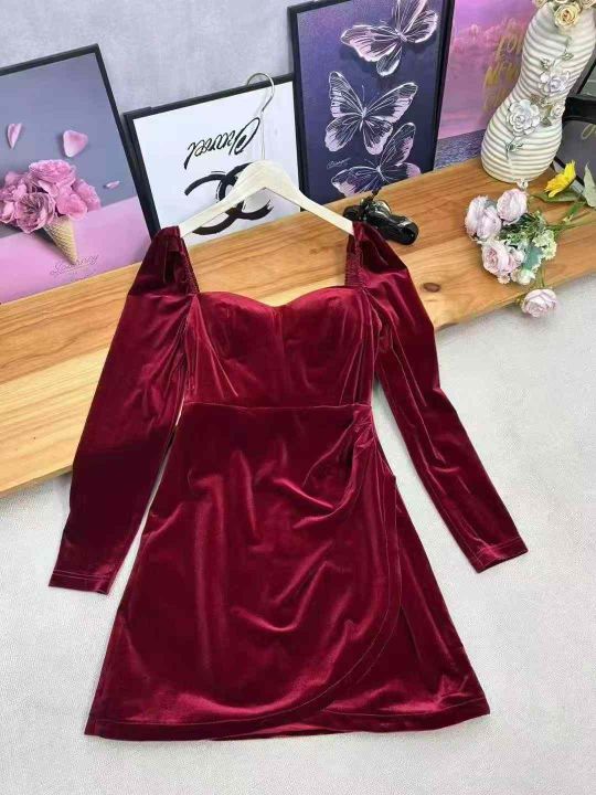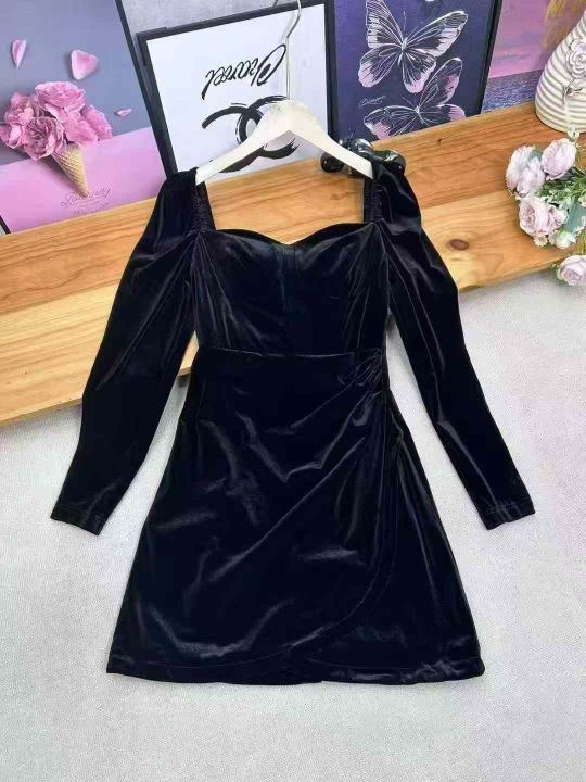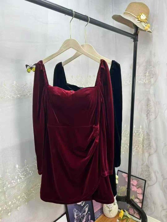 天猫店下架一批法式赫本风方领丝绒连衣裙女轻奢气质名媛收腰显瘦开叉修身连衣裙 全部独立包装 质感很好 面料高级 码数:S-XL一共80件左右 清仓价9.9