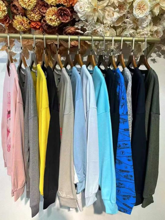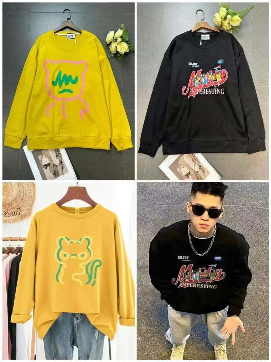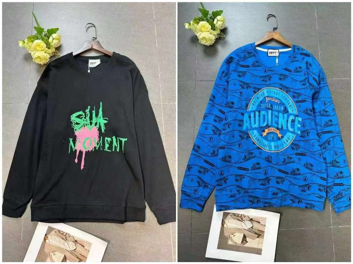 上身圆领卫衣[太阳]全清13.、300件、均码男女纯棉宽松休闲时尚字母图案印花长袖卫衣,大部分后领包边到肩,部分有吊牌,品质,这个性价比直接拉满✅全部全新独立包装、100/200件起多款混配13.3