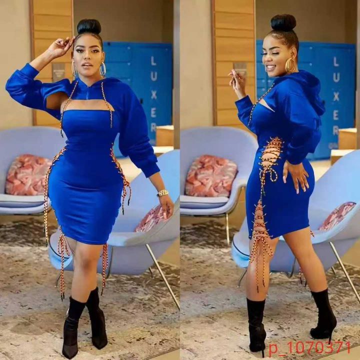 8.8清外贸时尚时装纯色镂空抽绳连帽卫衣连衣裙两件套...
