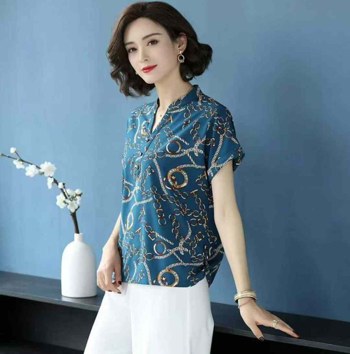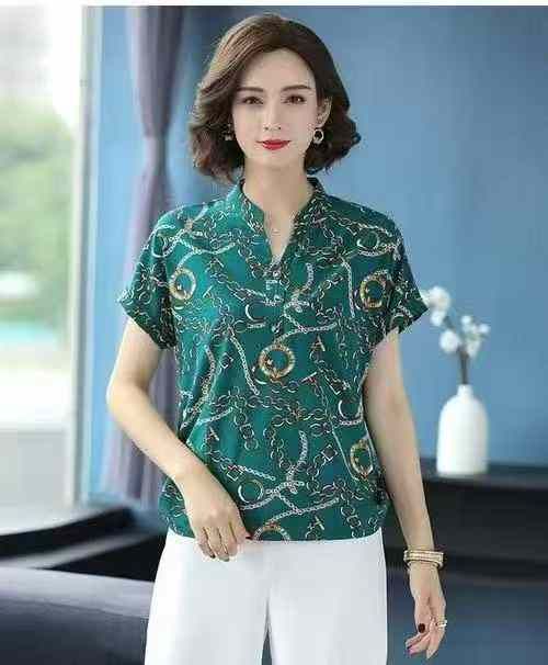 夏季新款时尚洋气宽松中年妈妈气质印花雪纺衫,独立包...