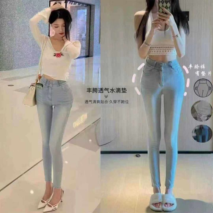 ☕️高弹力韩版辣妹高腰丰胯双扣弹力包臀牛仔长裤女显瘦浅色做旧小脚裤子55...