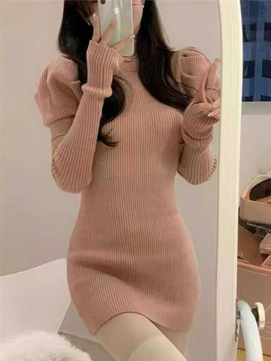 新款针织辣妹连衣裙秋冬季设计感泡泡袖打底内搭毛衣裙,兔绒包芯纱,面料舒...