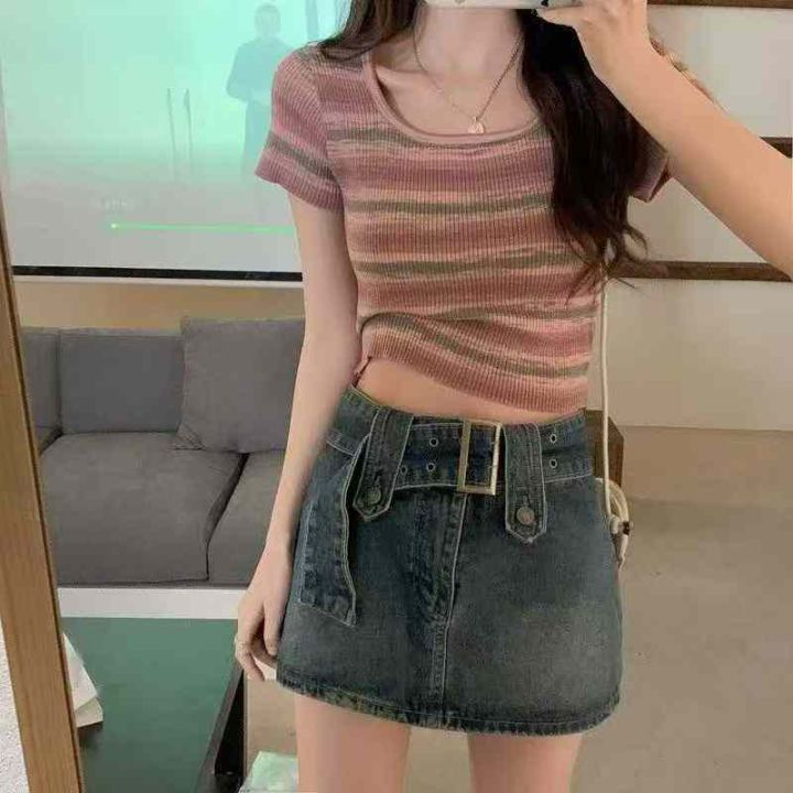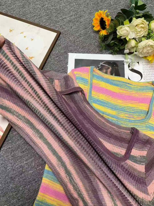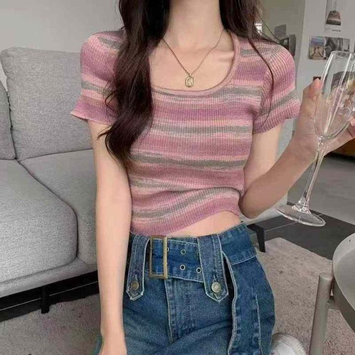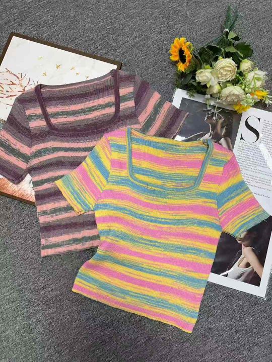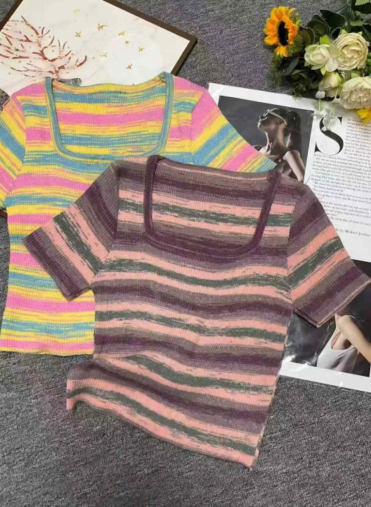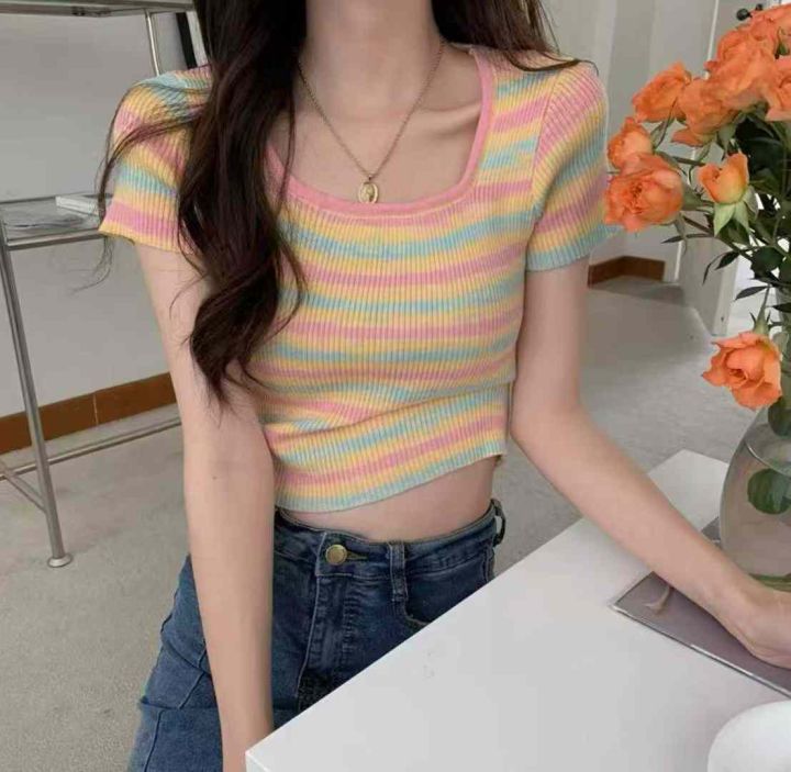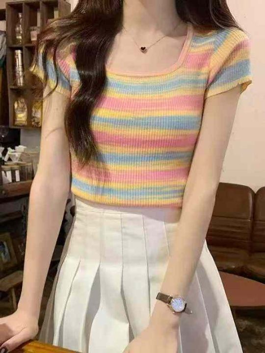 夏季新款撞色彩虹条纹靓妹针织短袖小衫,独立包装,均...