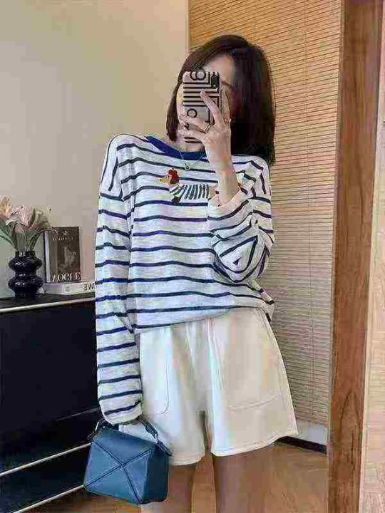 夏季透气撞色条纹长袖T恤女宽松薄款纯棉上衣,图片款,品质好可入实体店,...