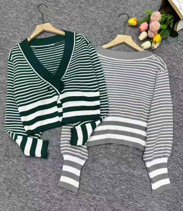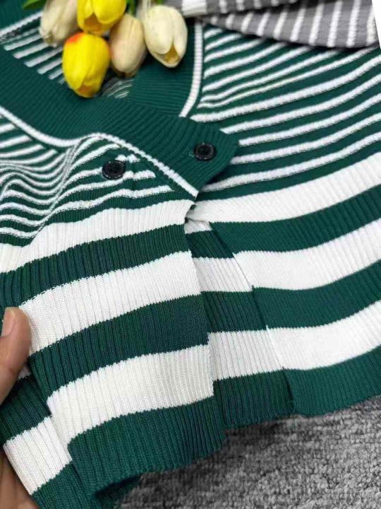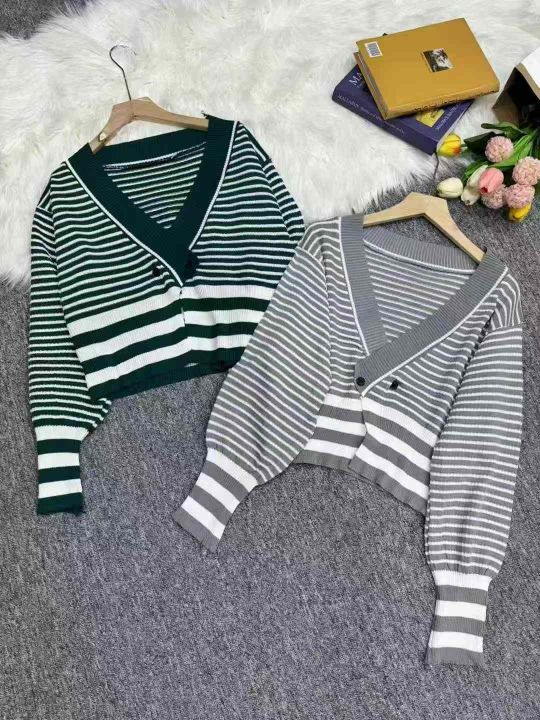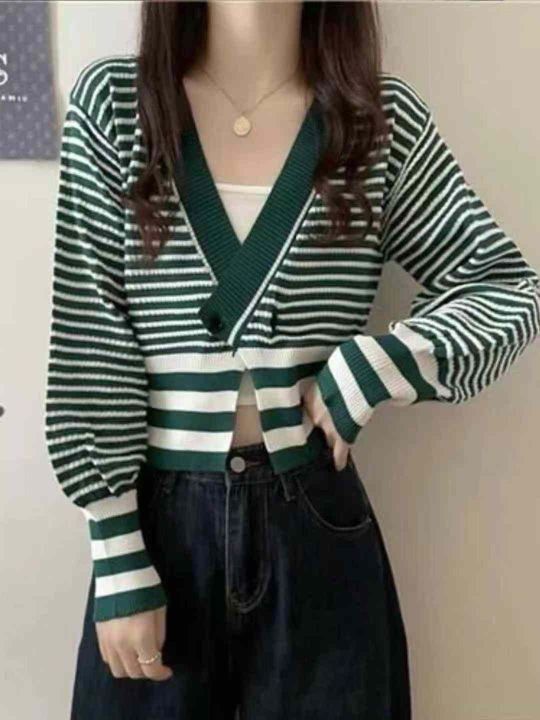 800件复古条纹长袖针织外搭开衫韩系V领纯色套头打底针...