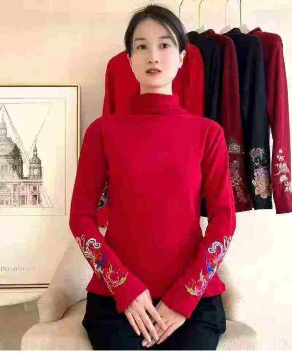 446件,秋冬新款德绒打底文艺复古刺绣百搭上衣民族中式高领保暖德绒长袖T恤...