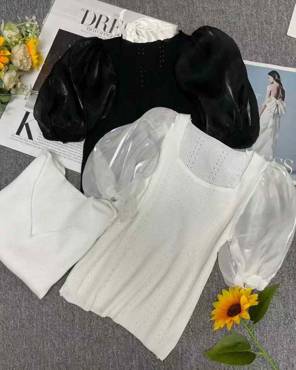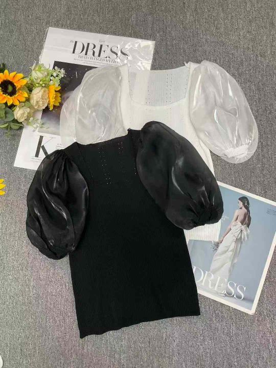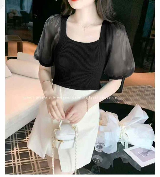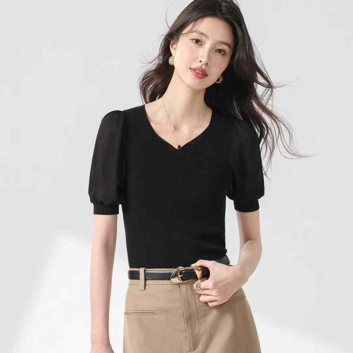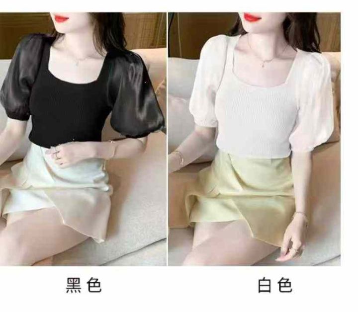 夏季新款法式复古雪纺拼接泡泡袖冰丝短袖针织小衫,独...