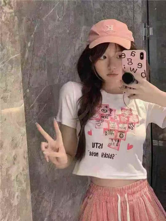 全清价6.9夏季新款爱心印花圆领甜美百搭辣妹短袖短款棉T恤,独立包装,后领...
