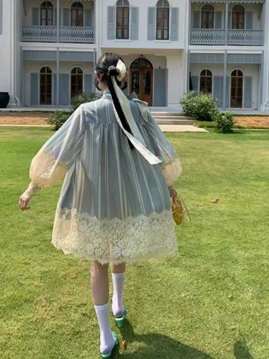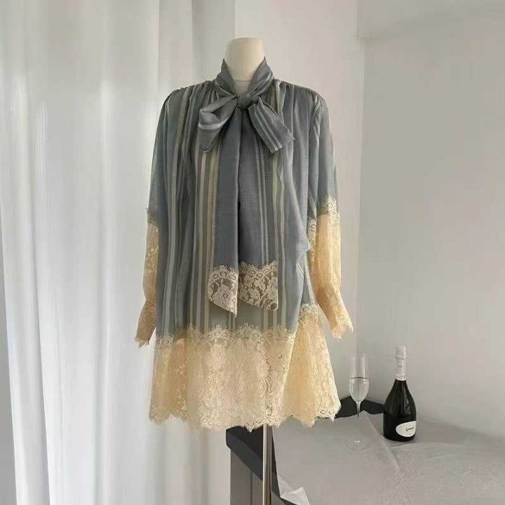 周雨彤庄洁同款法式重工拼接蕾丝连衣裙条纹衬衫裙女,...