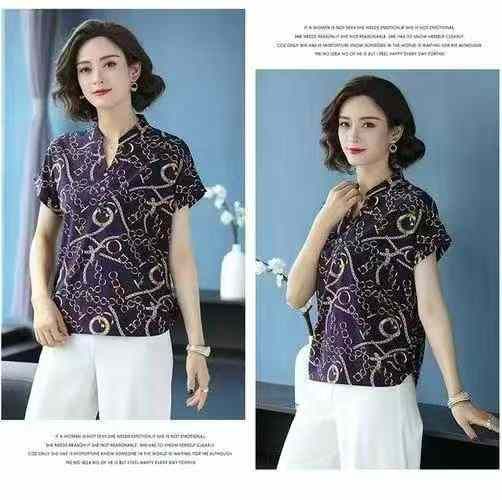 夏季新款时尚洋气宽松中年妈妈气质印花雪纺衫,独立包...