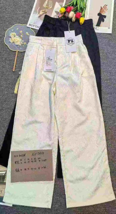 品牌爆款新中式国风高腰显瘦浮雕缎面直筒阔腿裤,腰部包边,加长款适合身高170cm以下,[庆祝]合计770件左右,尺码XS-2XL,齐码齐色,穿70-145斤,[爱心]万佳档口新货,0️⃣瑕疵,[666]直播实体店爆款,[哇]线下两三百高品质,错过拍大腿,[勾引]分货加一