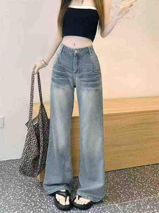 秋季新款洗水棉网红复古蓝半松紧腰阔腿牛仔裤,独立包...