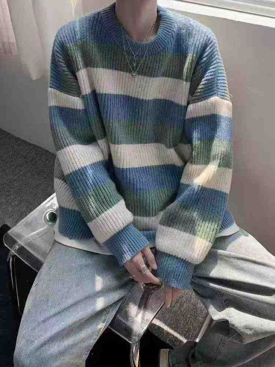 ☆7.8元,秋冬季慵懒风情侣百搭条纹宽松圆领毛衣,男女同款,100件,M-2XL...