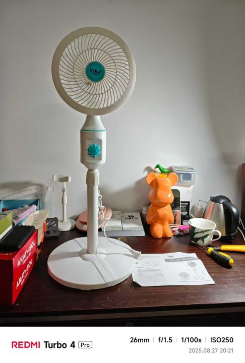 出厂原箱,高度75~90Cm,三档风速,可摇头,可调节上下仰角,线长1米3,2根扇插……