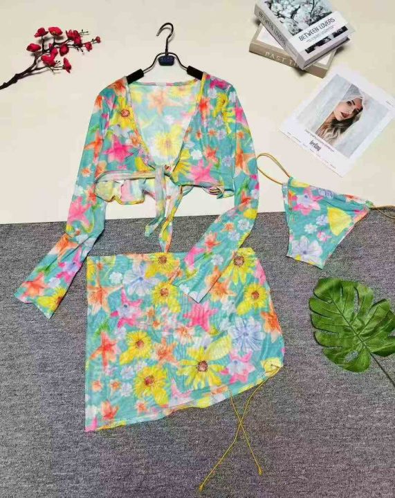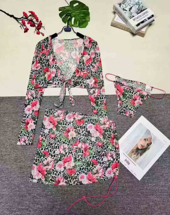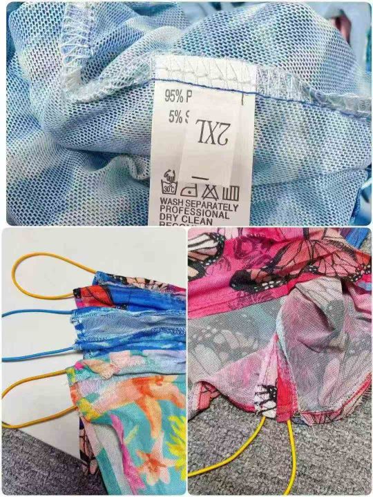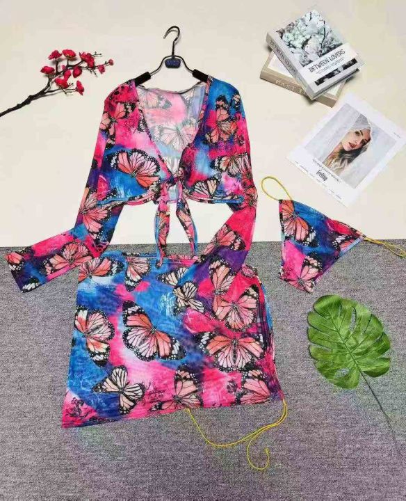 欧美女装性感网纱印花 抽绳长袖短裙三件套,数量:124套,码数:M-2XL,图片款,品质好,有独立包装。